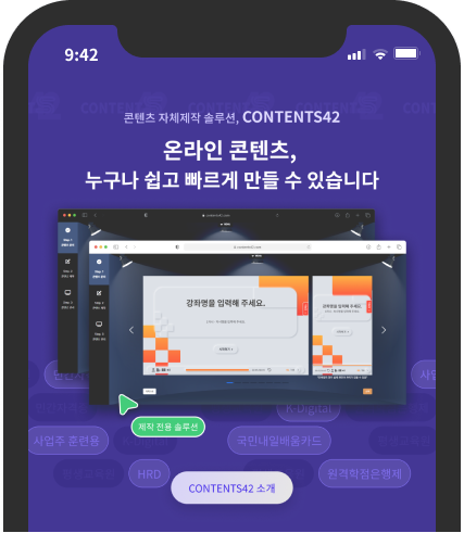 CONTENTS42는 HTML5 형식의 온라인 콘텐츠를 만드는것에 중점을 두고, 시간절약과 편리함을 동시에 추구하여 개발된 솔루션입니다.